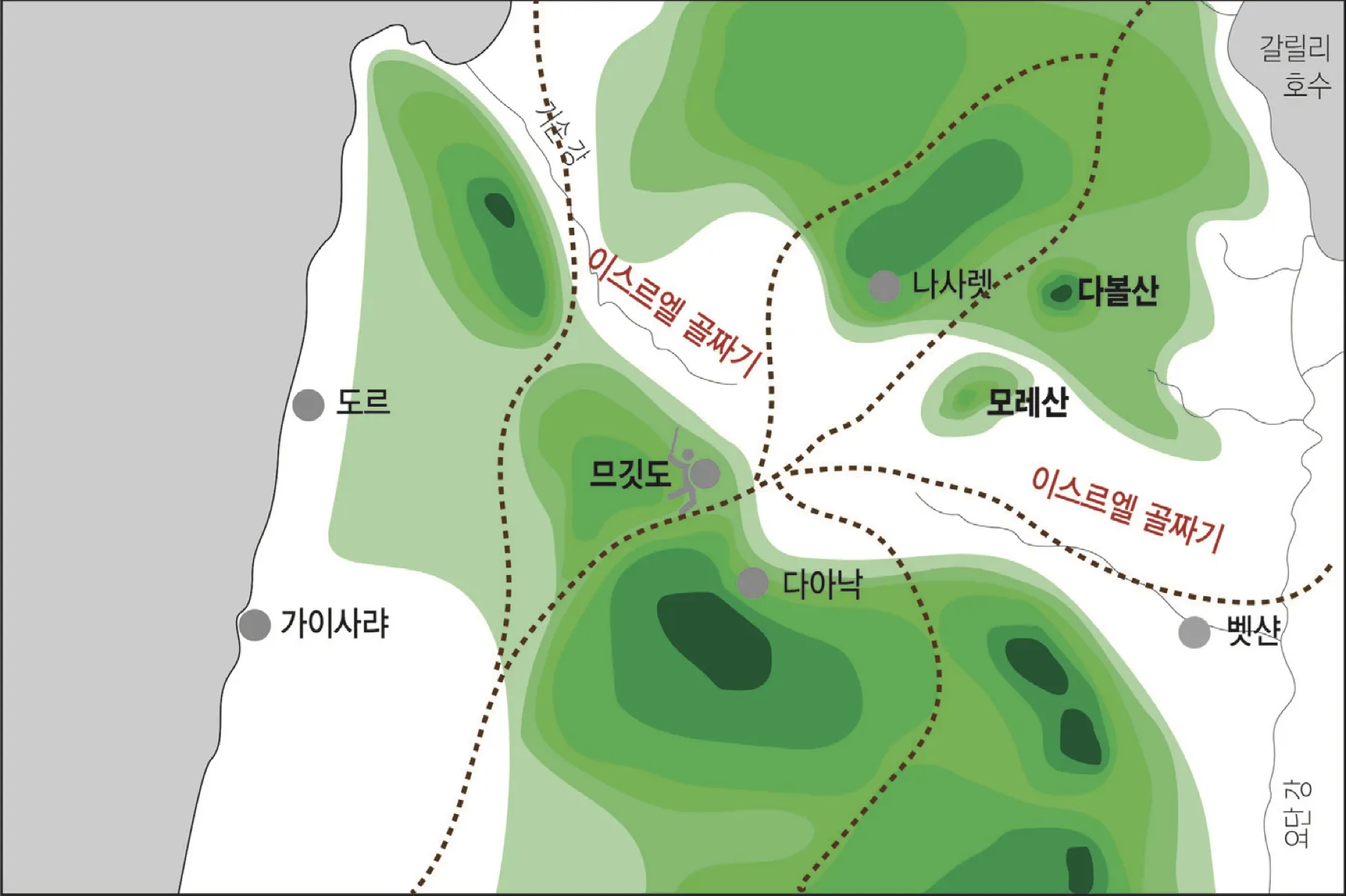 [이스르엘 골짜기 주변의 지형과 길들] 이스라엘을 동서로 가르는 이스르엘 골짜기의 므깃도는 예로부터 교통의 중심지 였다.