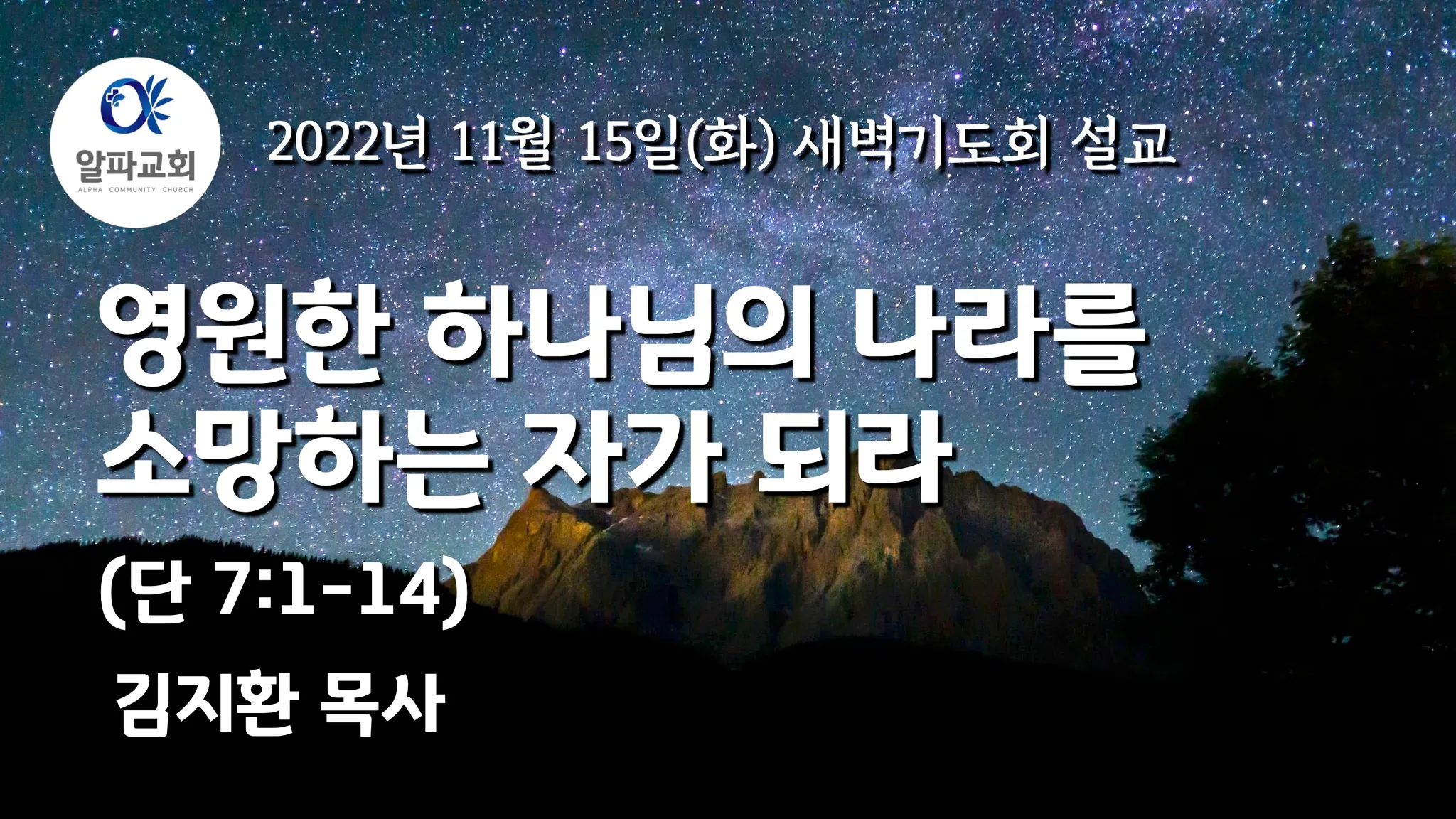 할렐루야 오늘 이 새벽에 알파교회 새벽기도회에 참여하시고 또한 온라인으로 말씀을 들으시는 여러분 모두에게 우리 주님의 평강이 가득 넘치시길 주님의 이름으로 축복합니다.