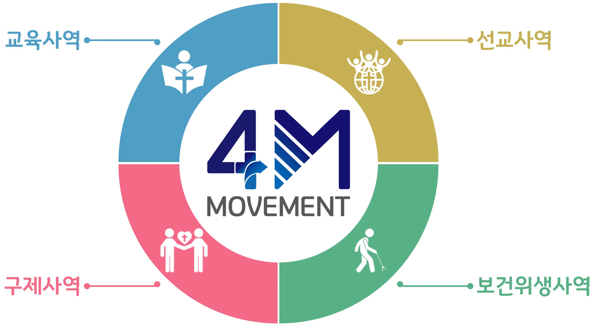 4M( 4 Missional Life Movement) I 교육 사역, 보건・의료 사역, 선교사역, 구제사역 등 4가지 영역의 선교적 삶을 의미합니다.