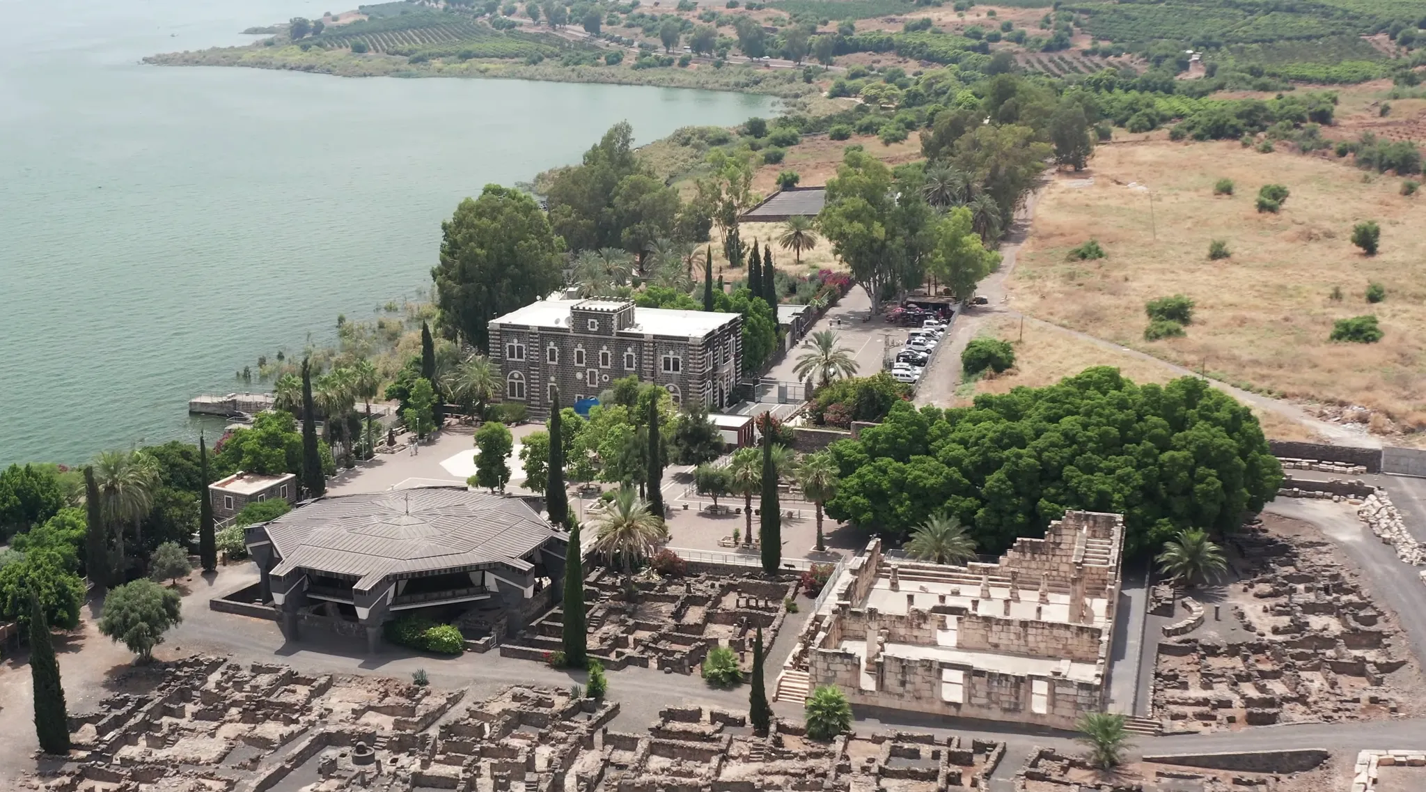 [가버나움 전경] 우측에 보이는 것이 가버나움 회당이며, 좌측 팔각형 지붕으로 되어 있는 건물이 베드로의 집터 위에 세워진 가버나움 교회입니다.