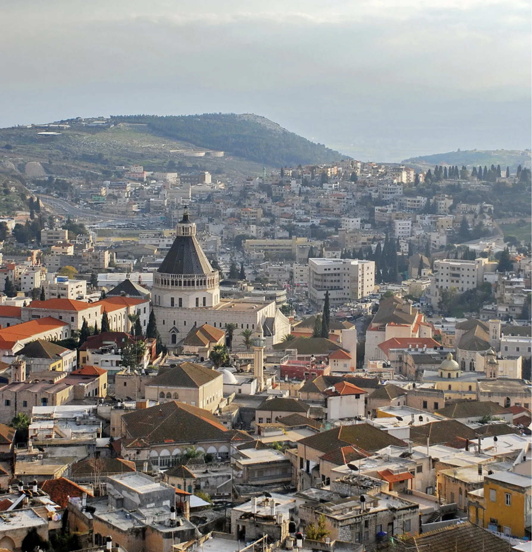 나사렛은 예수님께서 사역을 시작하기 전까지 사셨던 곳으로 주님의 발자취를 찾아 성지를 찾는 사람들에게 빼놓을 수 없는 장소 가운데 하나로 갈릴리호수에서 서남쪽으로 31km쯤 떨어져 있으며 도시의 남쪽 산 능선에 오르면 이스라엘 최대 곡창지대인 이스르엘평야가 한눈에 내려다보이는 곳입니다. 나사렛은 모든 시대를 걸쳐 순례의 발길이 끊이지 않았던 성지입니다. 그래서 나사렛에는 순례자들을 상대로 한 상점이나 식당, 그리고 숙박업소들이 즐비합니다. 그리고 외국 순례자들을 늘 맞이하여서인지 외국인을 보는 시선이 참 자연스럽습니다.