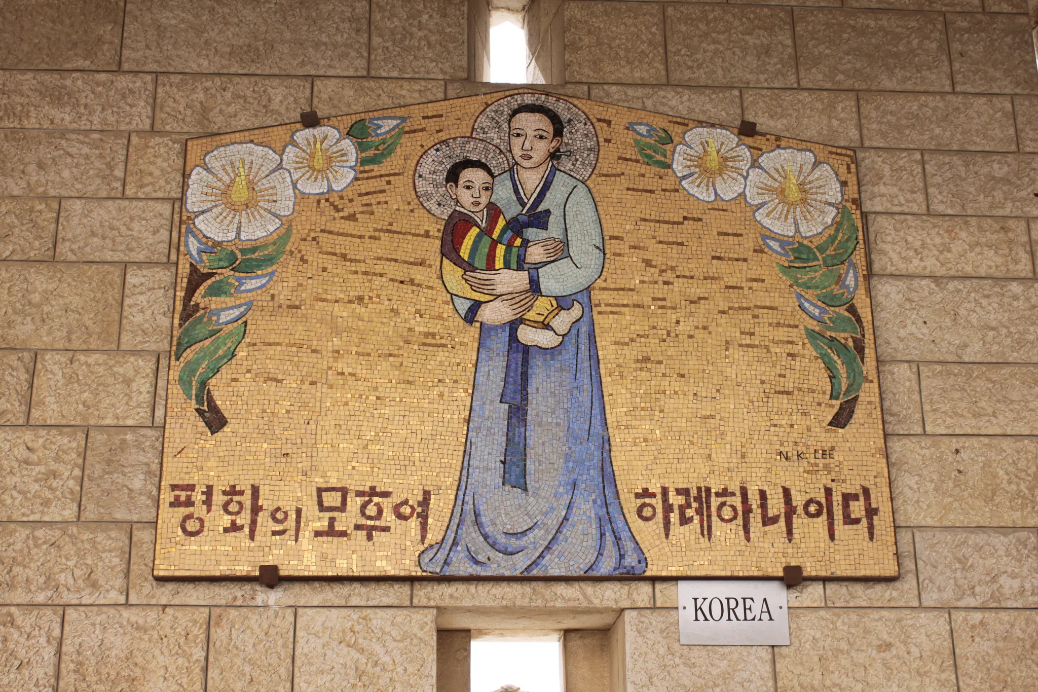 먼저 교회에 들어서면 교회 벽면이 전 세계에서 보내 온 성화들로 가득 차 있습니다. 이 중 눈에 띄는 낯익은 성화가 한 점 있습니다. 한복을 입은 마리아가 색동옷을 입으신 어린 예수를 안고 있는 그림입니다. 이 그림은 이남규 교수가 이 교회를 지을 때 한국 천주교에서 헌물했습니다.