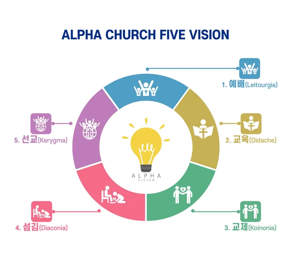 초대교회는 예배 때마다 예수님의 몸과 피(성찬)를 함께 나누며(행2:42), 복음 전파의 사명과 비전을 공유한 Communion 공동체(성찬식, 같은 종교를 믿는 공동체, 성도들 간의 영적 교감을 의미)로, 이들은 5가지의 선교적 분야를 통해 복음 전파의 사명과 비전을 함께 공유해 나아갔습니다. 5가지 선교적 분야는 레이투르기아(예배와 경건), 디다케(교육), 코이노니아(교제), 디아코니아(섬김과 봉사), 케리그마(복음선포와 선교)입니다. 따라서 CI의 우측부분은 하나됨을 상징하는 CI의 본체로부터 5개의 불꽃이 피어 나오는 모양으로 형상화하여 알파교회 공동체가 훈련받고, 추구해야 할 5가지의 선교적 분야를 나타내었으며, 불꽃 모양은 불과 같은 성령의 능력을 상징합니다.