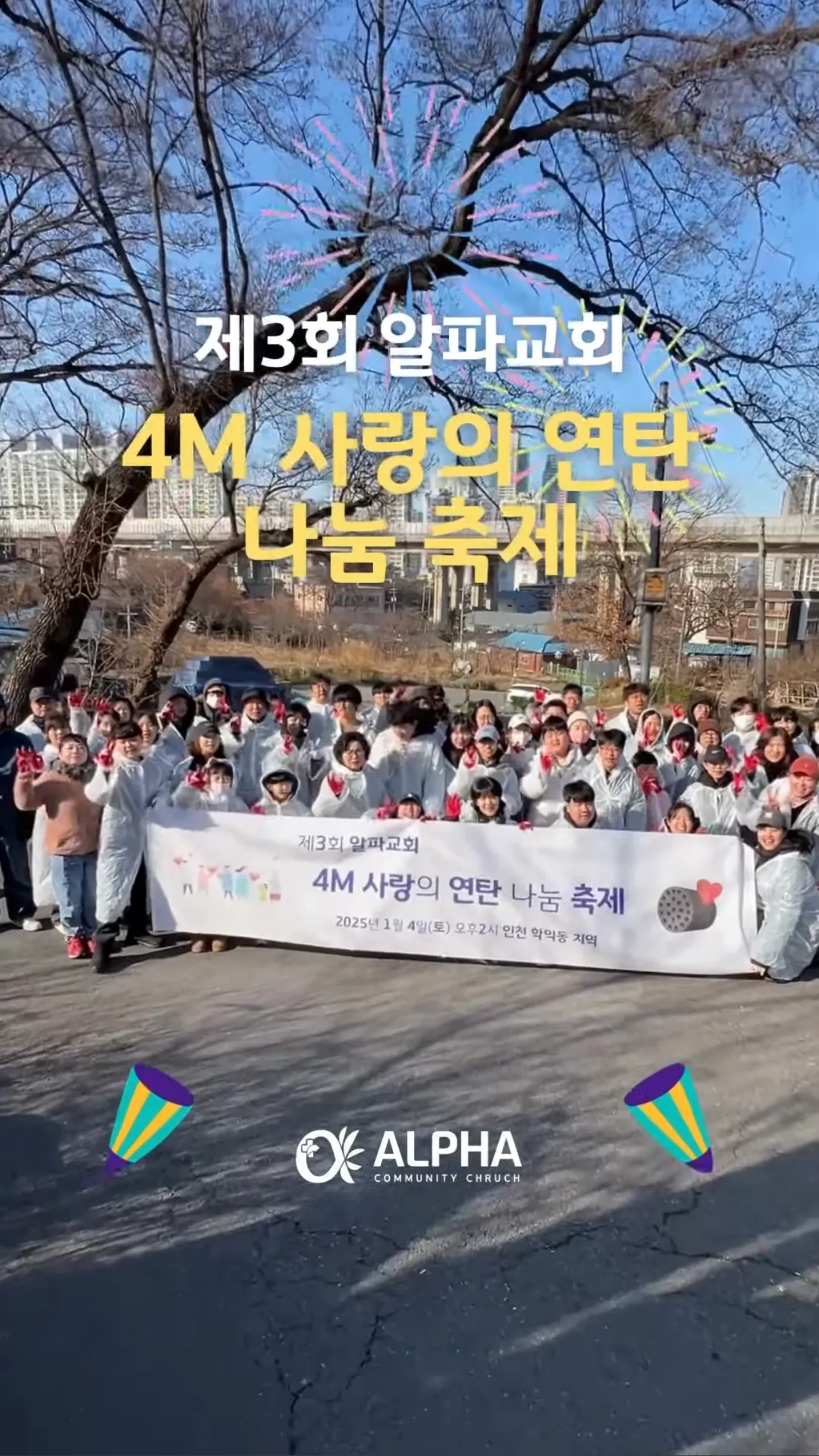 2025년 1월 4일 알파교회는 제3회 사랑의 연탄 나눔 축제 행사를 가졌습니다. 이번 행사는 이봄학교(기독대안학교)와 함께 협력하여 진행하였으며, 인천연탄은행에 3,000장을 기부하였습니다. 앞으로도 알파교회와 이봄학교가 하나님 나라 확장 위해 귀하게 쓰임 받도록 많은 관심과 기도 부탁드립니다.