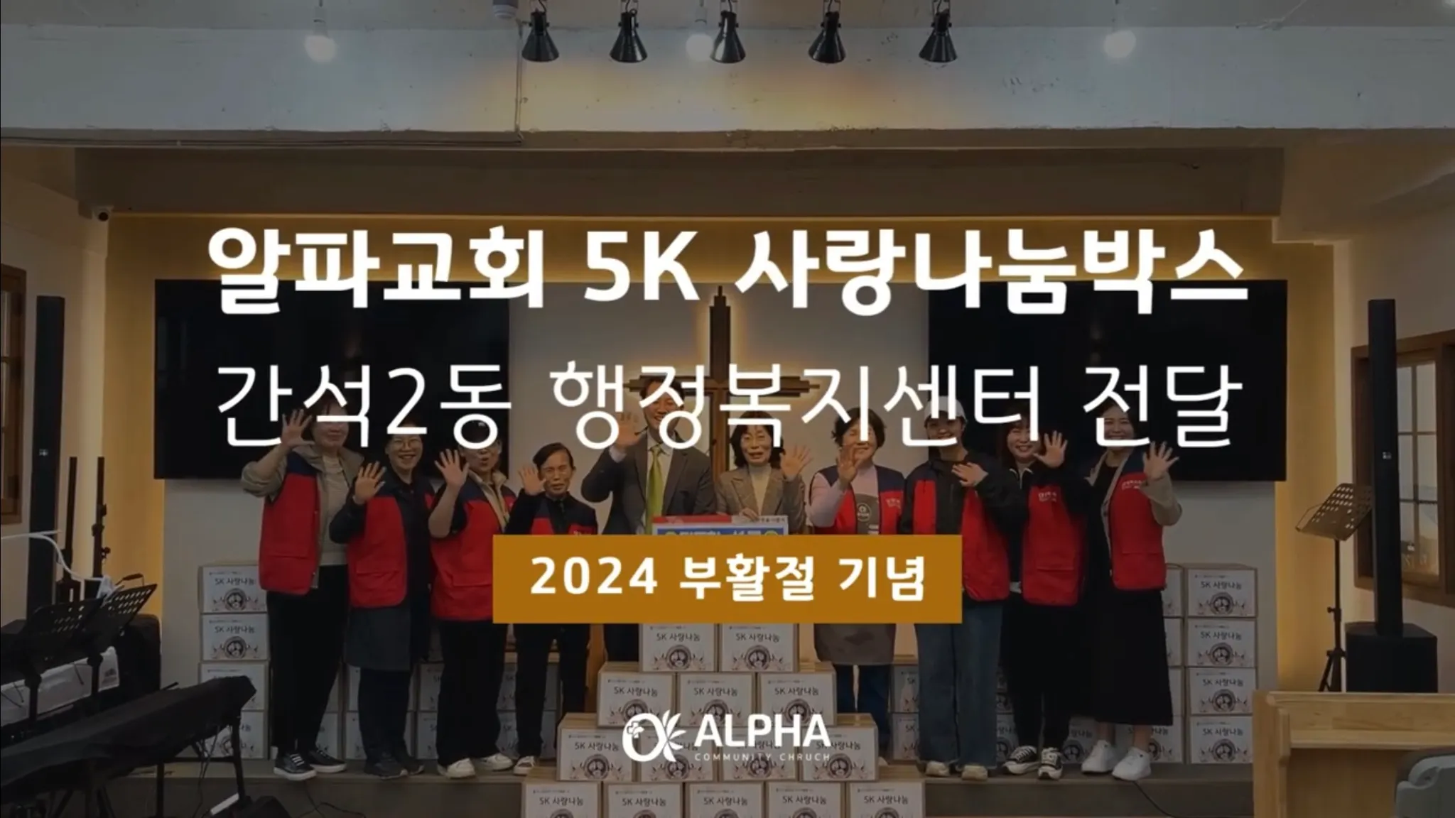 그러므로 알파교회는 기쁨의 50일 부활절기를 준비하면서, 예수께서 부활하신 감격과 기쁨을 교회 성도들과만 나누는 것이 아니라, 교회 주변에 있는 가난하고 소외된 자들과 함께 나누기로 정하고, 5K 사랑나눔 박스 50개를 준비하기로 하였습니다.