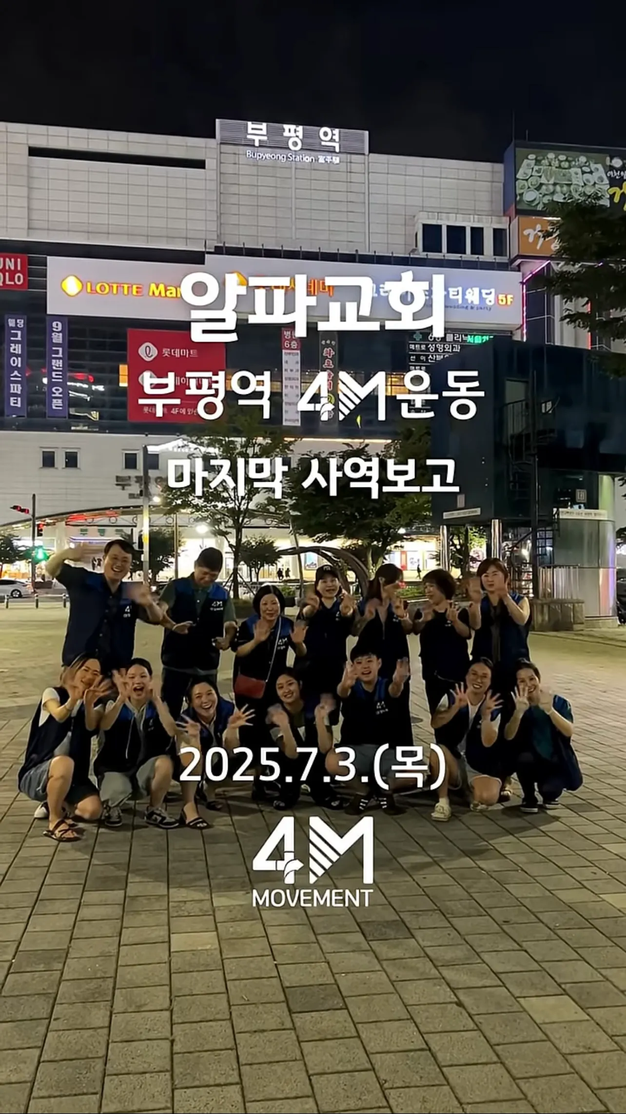 2025년 7월 3일 목요일 밤 9시, 알파교회는 지난 2년 6개월 동안 진행해 온 ’4M 부평역 짬뽕밥 나눔‘ 사역의 마지막 시간을 가졌습니다. 2022년 12월 29일에 시작된 이 사역은 매주 목요일 밤 노숙인들을 위해 짬뽕밥을 나누며 꾸준히 이어져 왔습니다.