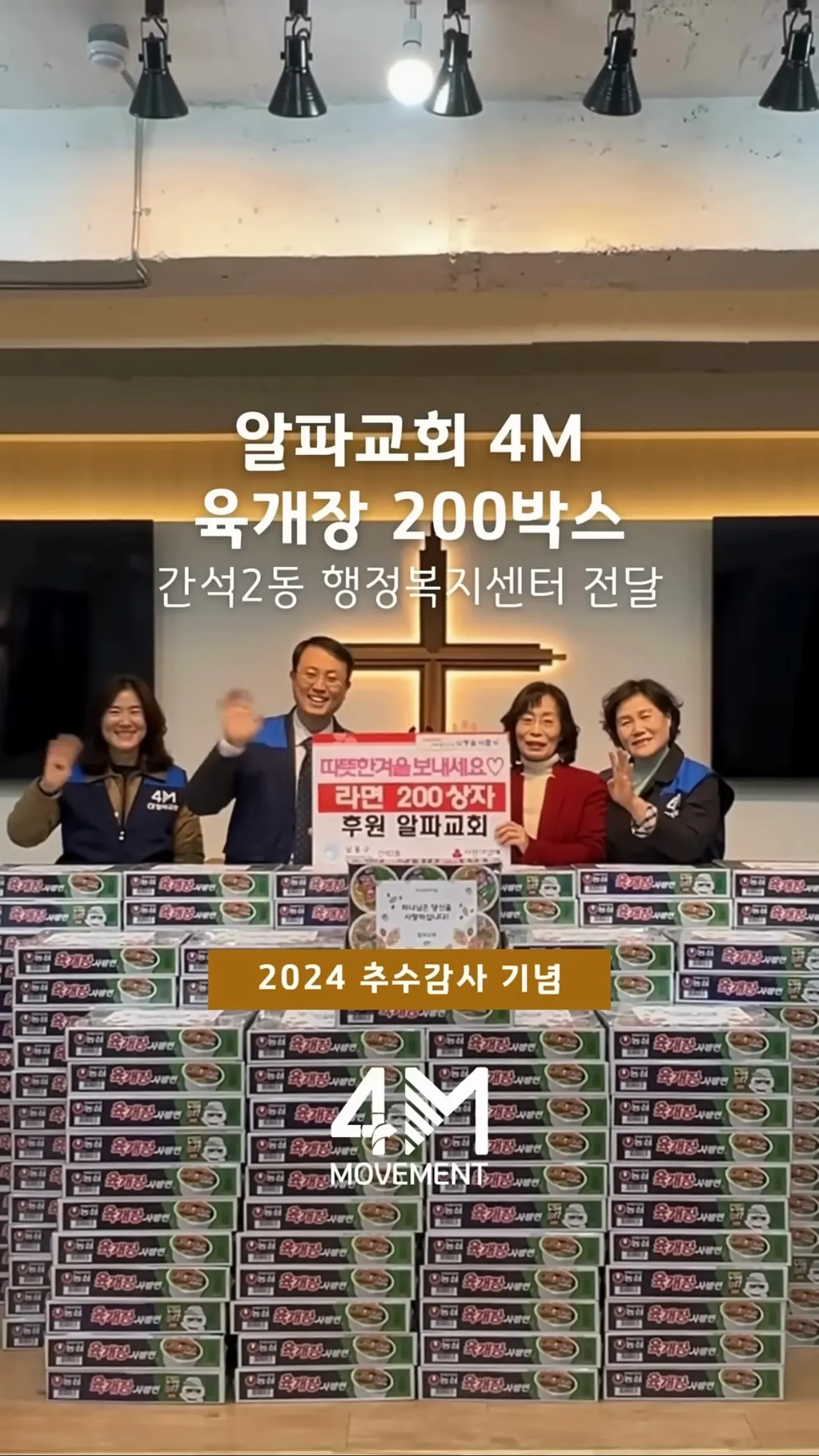 2024년 11월 20일 알파교회는 간석2동 행정복지센터에 4M 이웃사랑나눔으로 육개장 200박스를 전달하는 행사를 가졌습니다. 추수할 때 가난한 자들을 위해, 떨어진 이삭을 줍지 말라고 말씀하셨던 하나님의 말씀에 순종하여, 올 한해 하나님께서 베풀어주셨던 은혜에 대한 감사를 소외되고 가난한 자들과 함께 나누기로 한 것입니다.