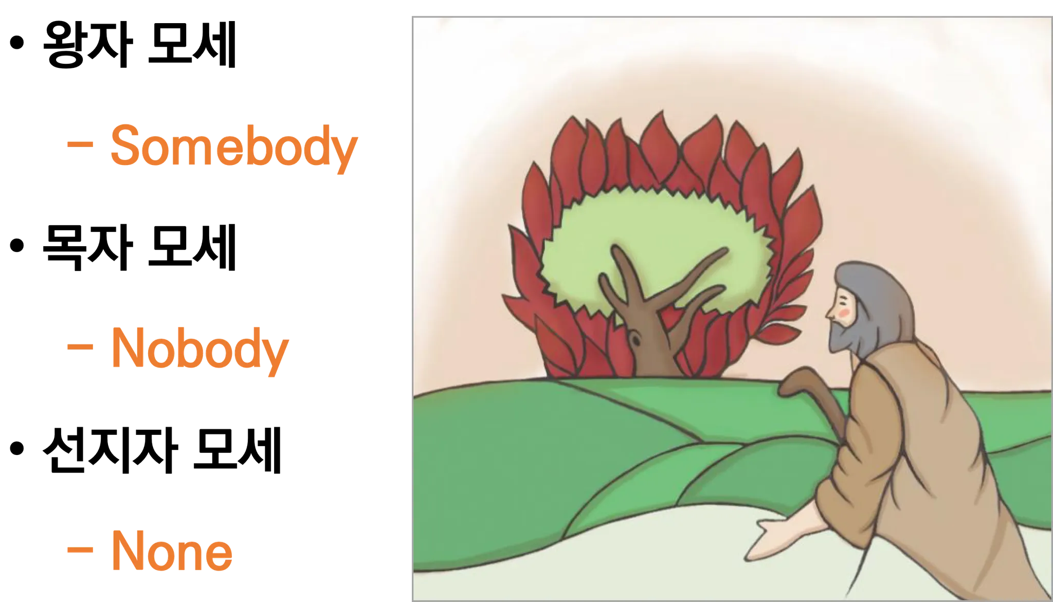 하나님은 인간의 잘 나가는 능력을 필요로 하지 않으십니다. 하나님은 순종하는 자를 원하시며, 그 순종의 훈련을 쌓게 한 후에야 들어 쓰시는 하나님이십니다. 하나님께서 신위를 원하심을 꼭 기억하시기 바랍니다. 40년을 연단시키시고 내려놓음의 달인이 되게 하신 후에야 하나님은 그의 나이 80세가 되었을 때 호렙산 불타는 떨기나무에 나타나서 모세를 부르십니다.