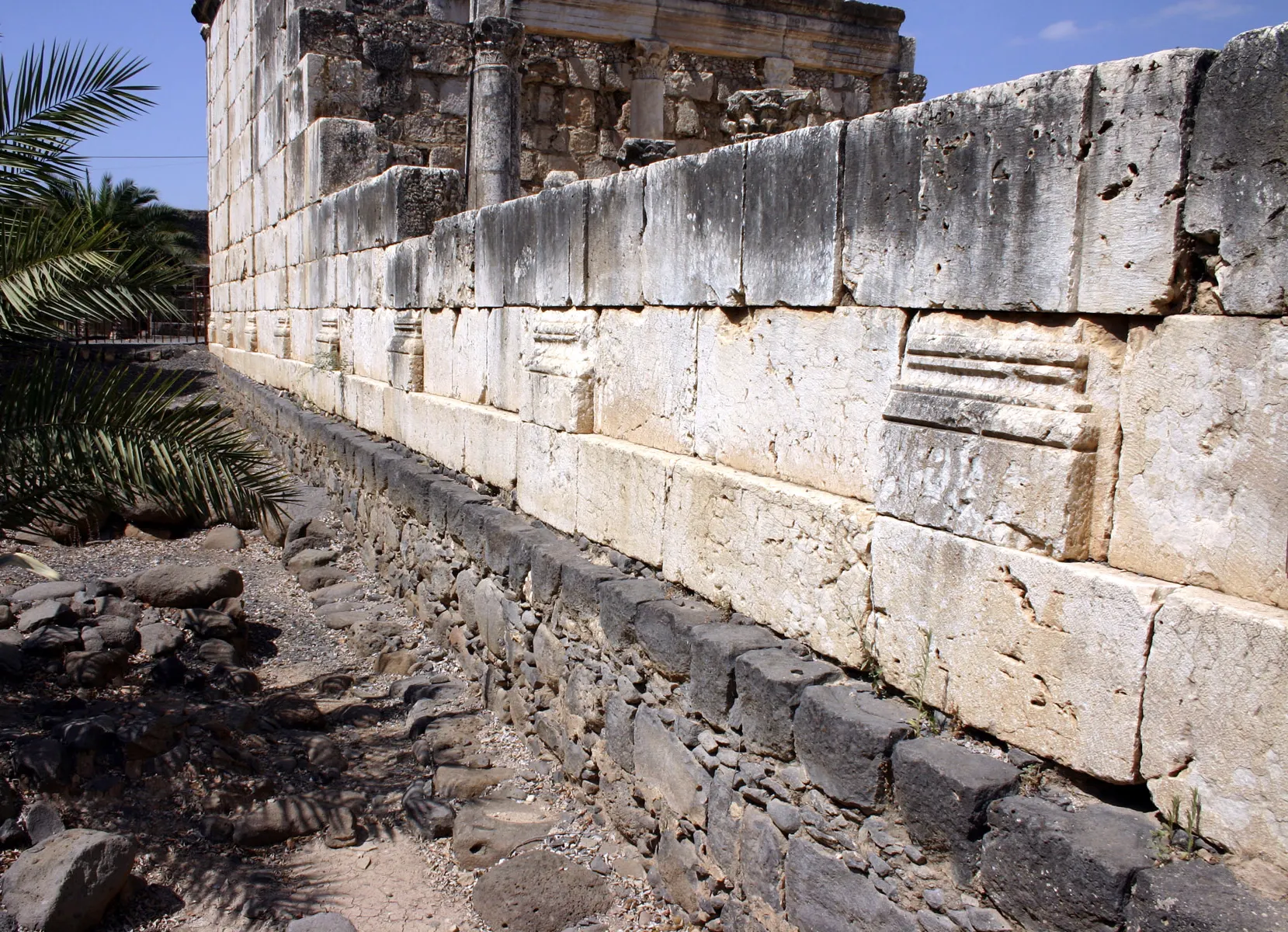 예수께서 설교하신 회당의 건축자는 로마 백부장이었습니다(눅7:5). 그러나 오늘날 우리가 볼 수 있는 회당은 주후 4세기 후반 또는 5세기 비잔틴 시대에 재건된 회당으로 석회암 재질로 이루어져 있으며, 옛 기초석 위에 다시 세워진 것입니다. 이 회당은 성지에서 회당의 형태가 아주 잘 보존된 유일한 회당입니다. 첫 회당의 기초석이 까만 현무암인 것을 보면, 당시 회당은 검은색이었을 것입니다. 그리고 지금과는 달리 예루살렘을 향해 세워졌을 것입니다. 1세기 회당은 모두 예루살렘을 향해 지어졌기 때문입니다. 그러므로 오늘날 가버나움에서 우리는 예수님보다 300년쯤 뒤에 재건된 회당을 보고 있는 것입니다.