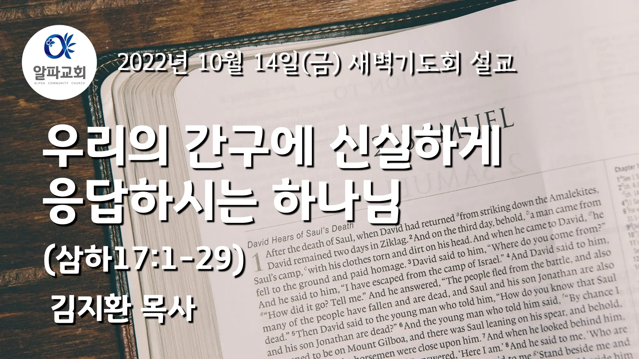 할렐루야 오늘 이 새벽에 알파교회 새벽기도회에 참여하시고 또한 온라인으로 말씀을 들으시는 여러분 모두에게 우리 주님의 평강이 가득 넘치시길 주님의 이름으로 축복합니다.