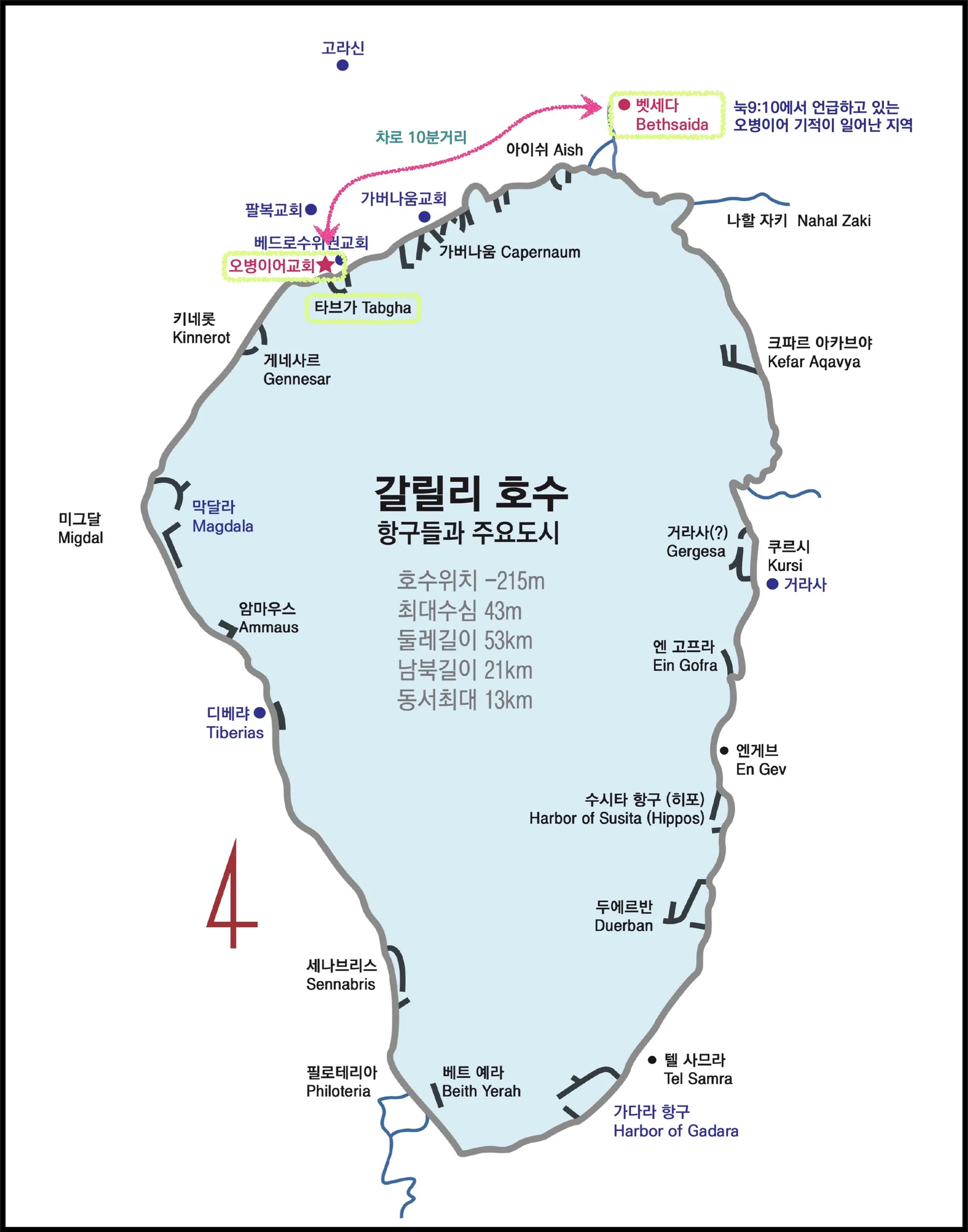 네 개의 복음서에서는 오병이어의 기적을 모두 기록하고 있습니다(마14:13-21; 막6:30-44; 눅9:10-17; 요6:1-14). 그런데, 누가복음 9:10을 보면 예수님께서 오병이어의 기적을 행하신 장소는 벳새다의 빈들이었다고 기록하고 있습니다. 그렇기 때문에 타브가의 현재 교회는 오병이어 사건과는 직접적인 관계가 없는 기념 교회가 되는 것입니다. 아래 지도에서 확인할 수 있는 것처럼 오병이어의 기적이 일어났다고 기록된 벳새다는 타브가에서 동북쪽 지역 있으며, 자동차로 10분 정도 떨어진 곳에 위치하고 있습니다.