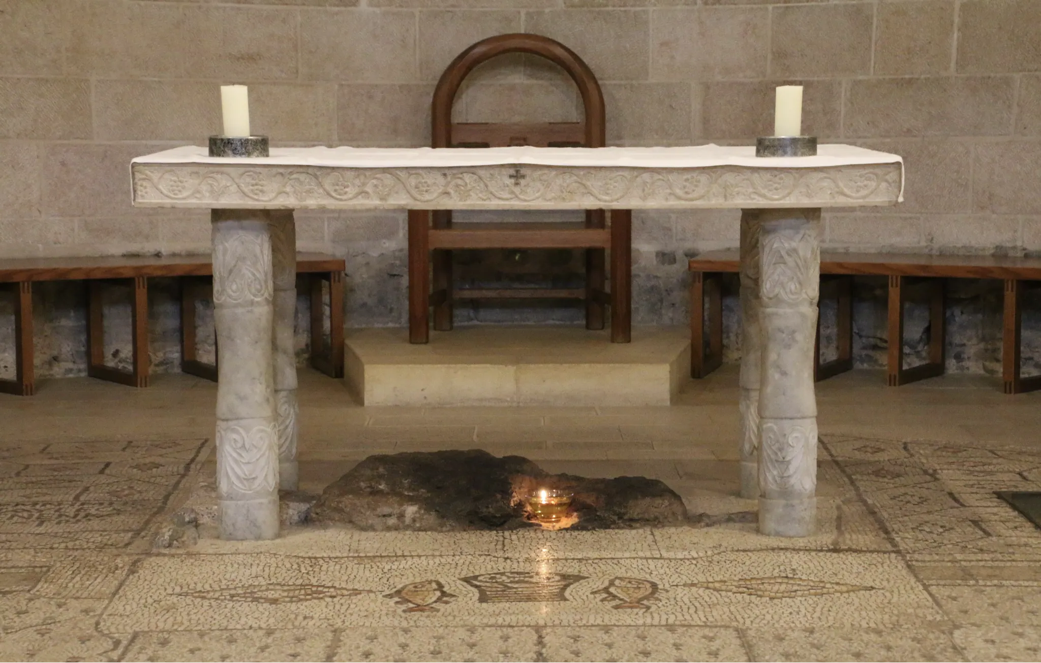 [오병이어교회 제단] 예수님께서 오병이어를 들고 축사하신 것을 기념하는 바위와 그 위 제단