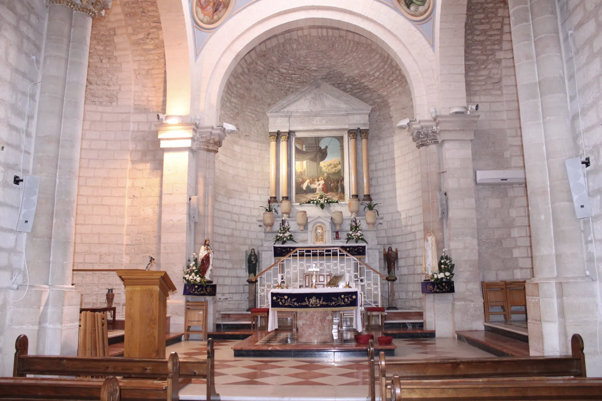 [교회 내부 제단의 모습] 예수님께서 6개의 돌항아리에 있는 물을 포도주로 만드신 것을 기념해서 제단 뒷편에 6개의 돌항아리가 있는 것을 볼 수 있습니다.