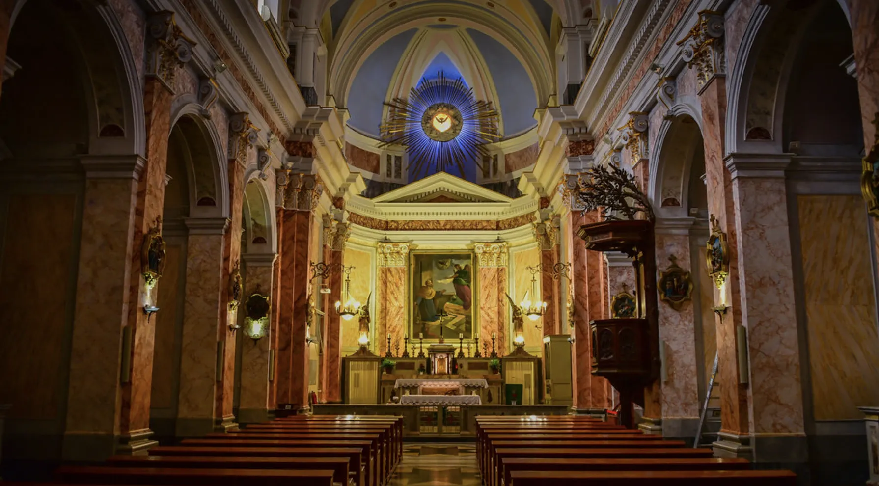[성 베드로교회 본당 내부] 베드로가 기도 중에 본 환상이 제단 뒷편에 있는 것을 볼 수 있습니다.
